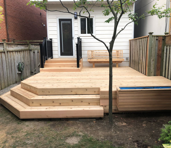 Pressure-treated lumber remains one of the most reliable and cost-effective materials for outdoor decks in the Toronto climate. We build pressure-treated decks with proper framing, fasteners, and drainage design to maximize the lifespan of every structure. A quality stain seals and protects the wood while giving it a polished, finished appearance.