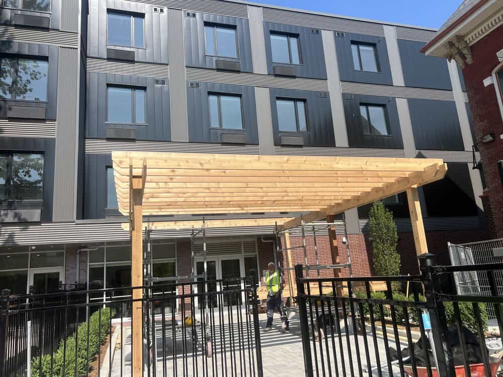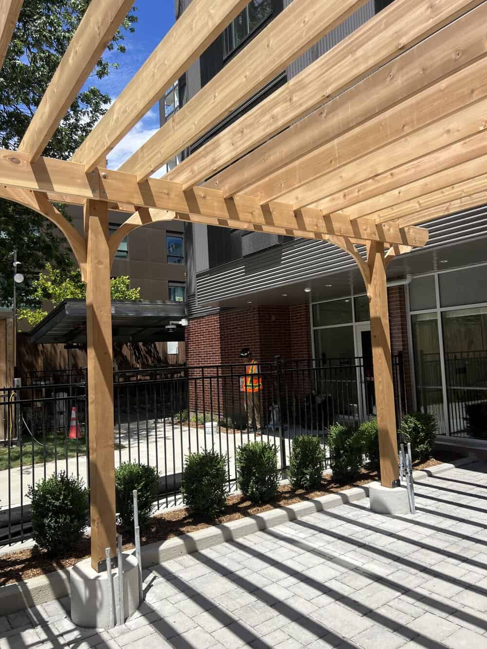 A custom cedar pergola was built to enhance the front entrance of a downtown condo ahead of its grand opening.