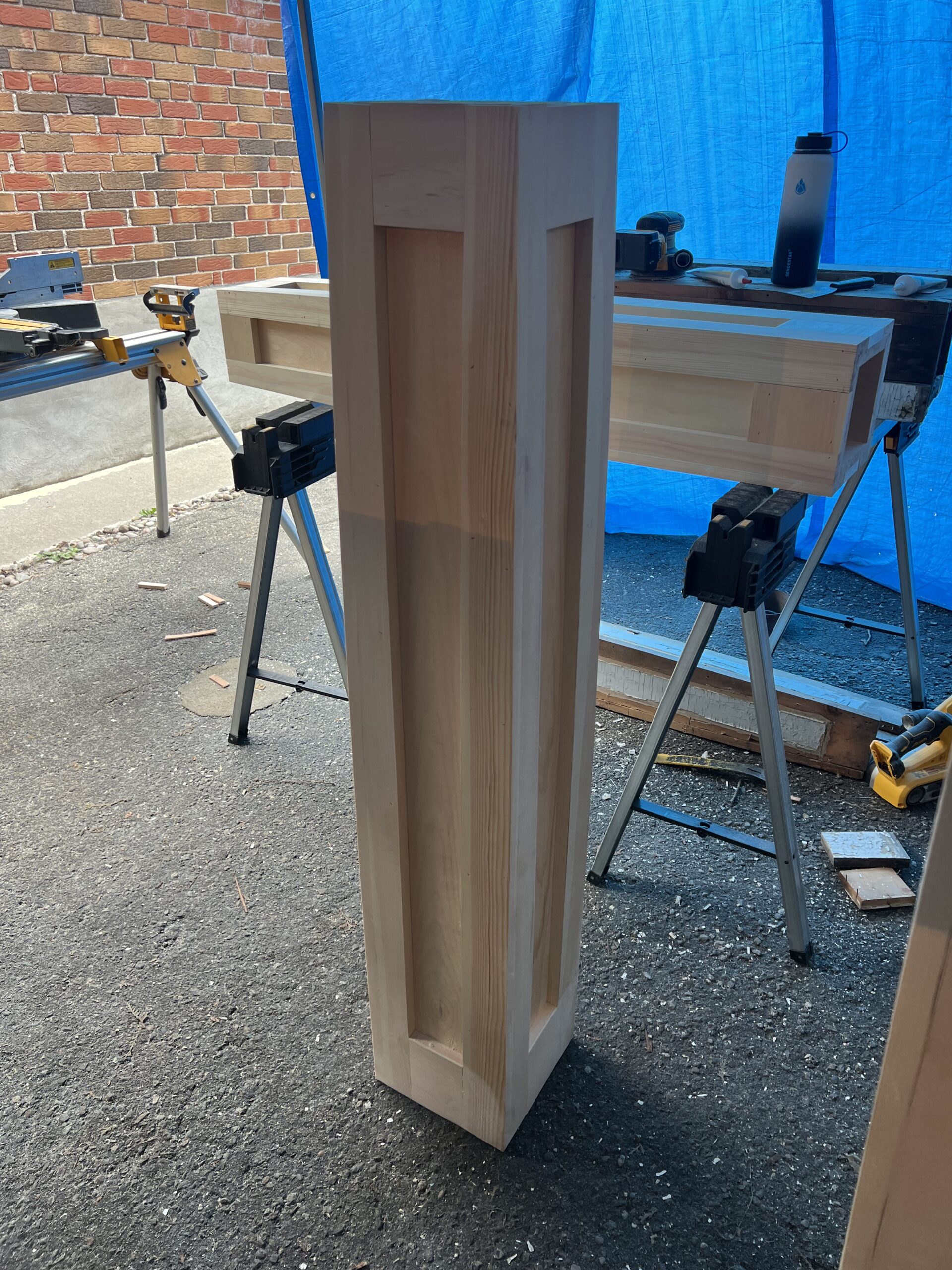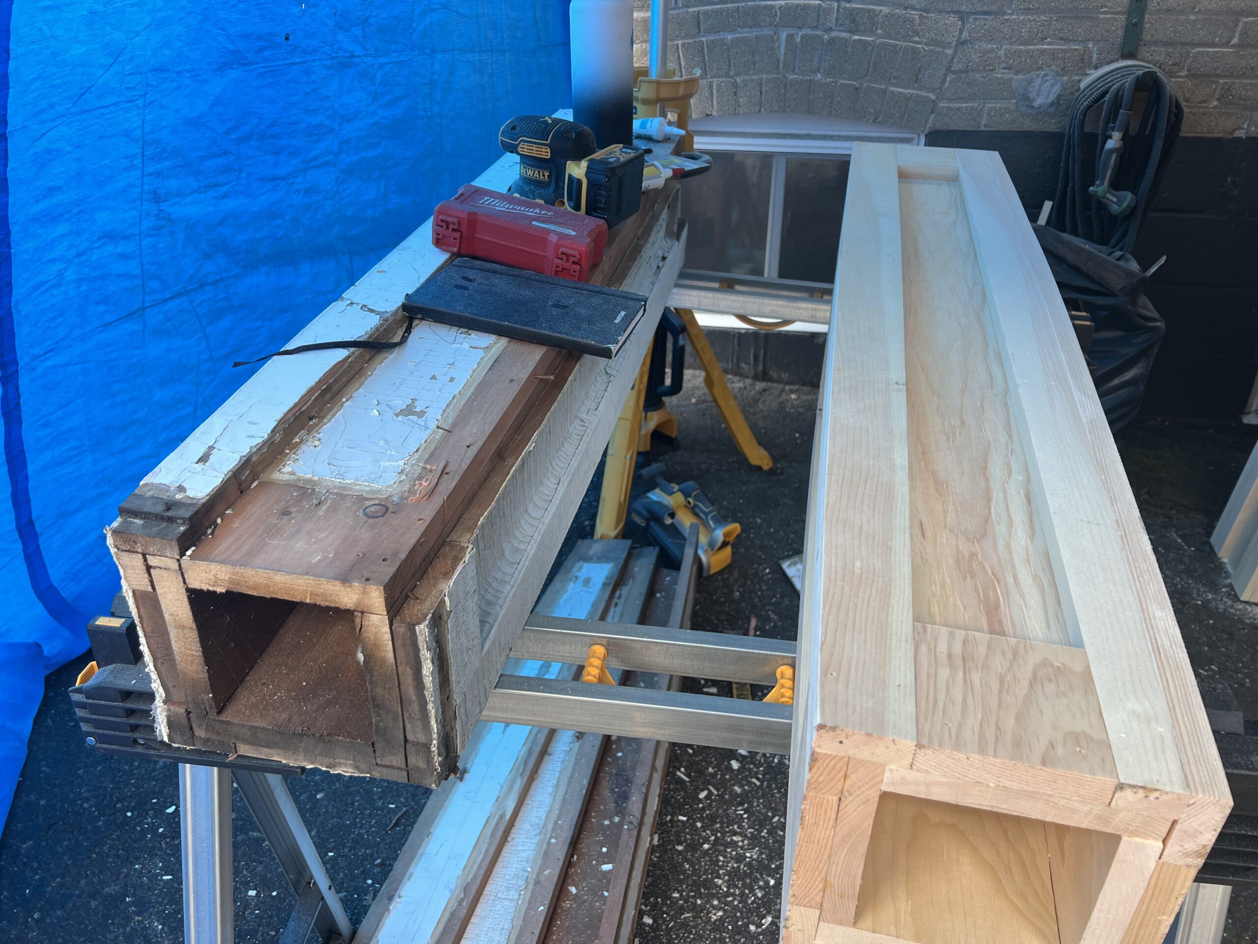 Clear pine was used throughout to ensure a consistent, knot-free finish. Each pillar was constructed with a subtle inward taper toward the top, replicating the slight angle of the original design.