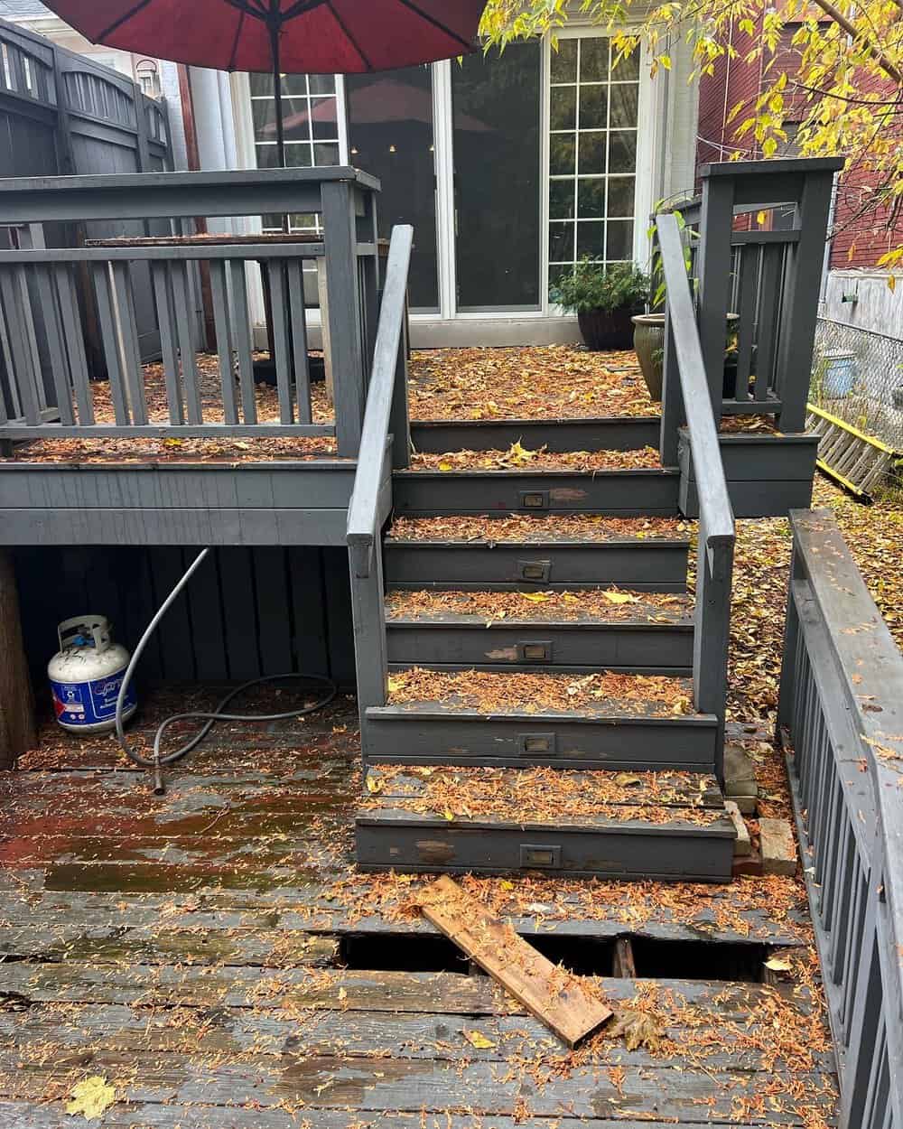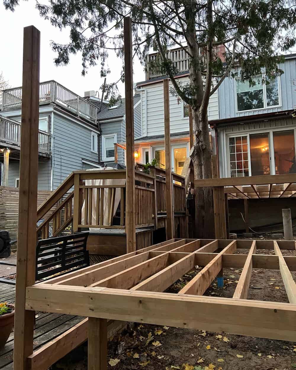 The new two-tier structure was built using pressure-treated lumber for the framing, providing long-term strength and resistance to outdoor conditions. The deck surface was finished with a composite material for a low-maintenance alternative to traditional wood.