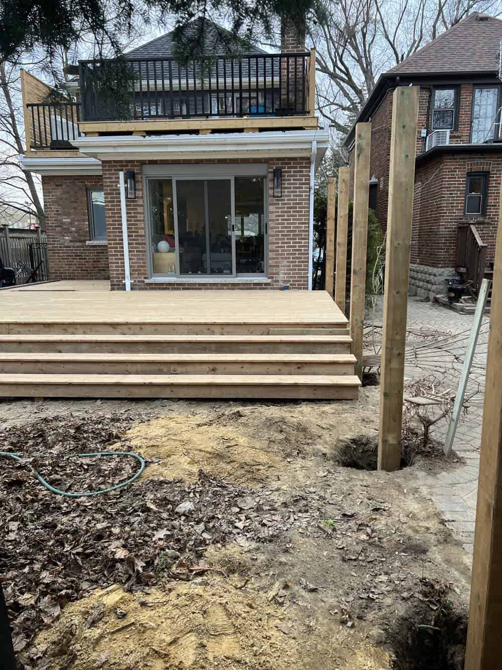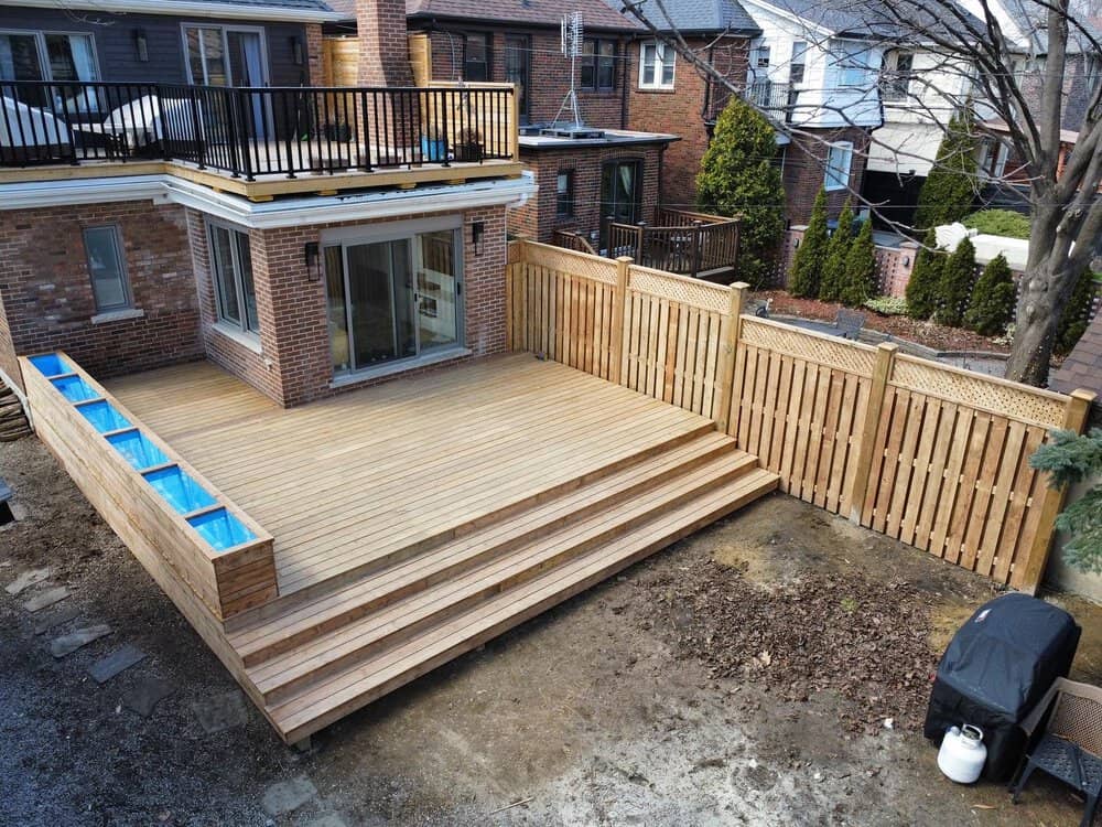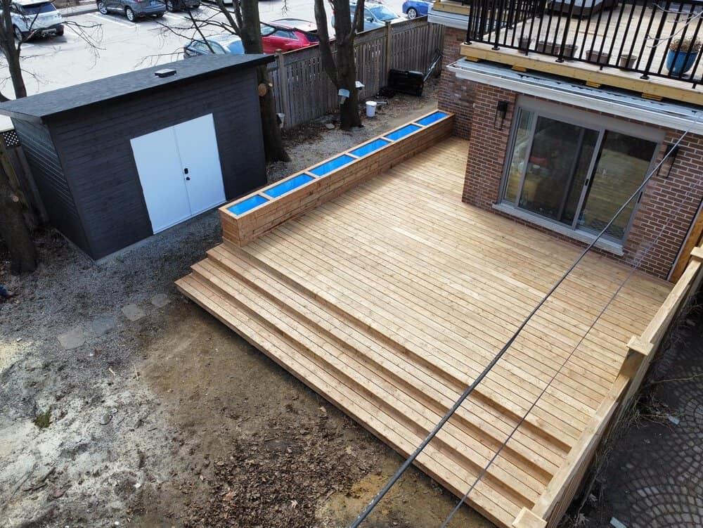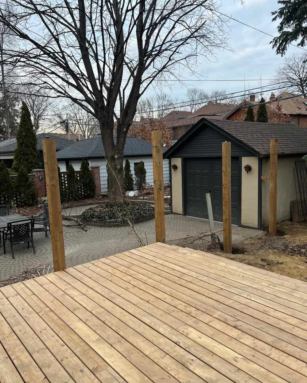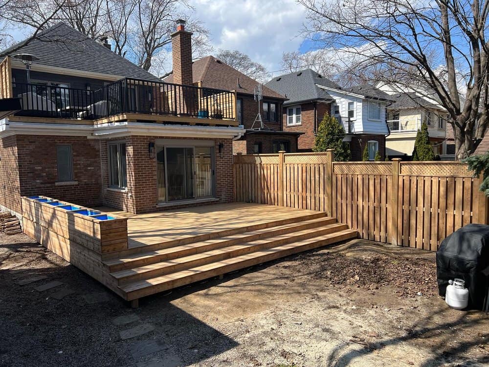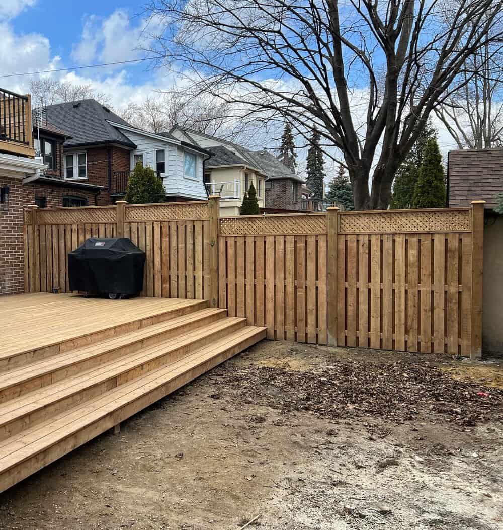 The rebuild focused on maximizing the entire area, with new deck and fence structures constructed primarily from pressure-treated lumber for durability and resistance to the elements. A new storage shed was also built to improve functionality and provide dedicated space for outdoor equipment.