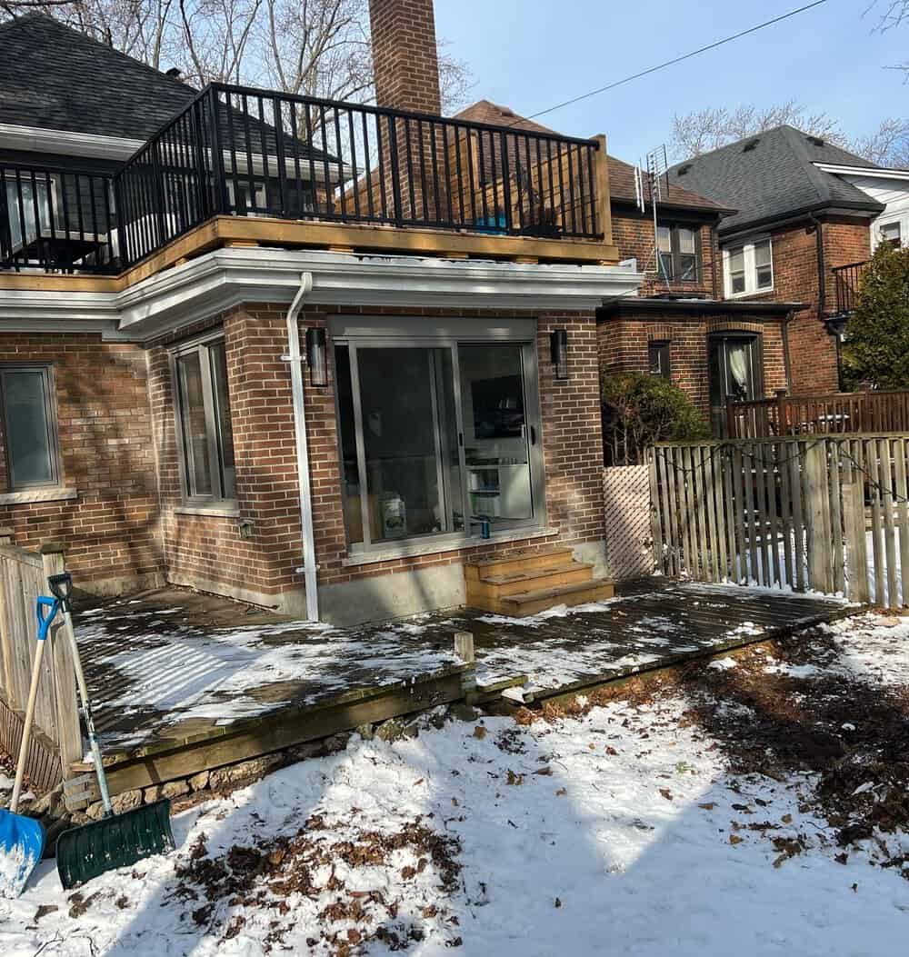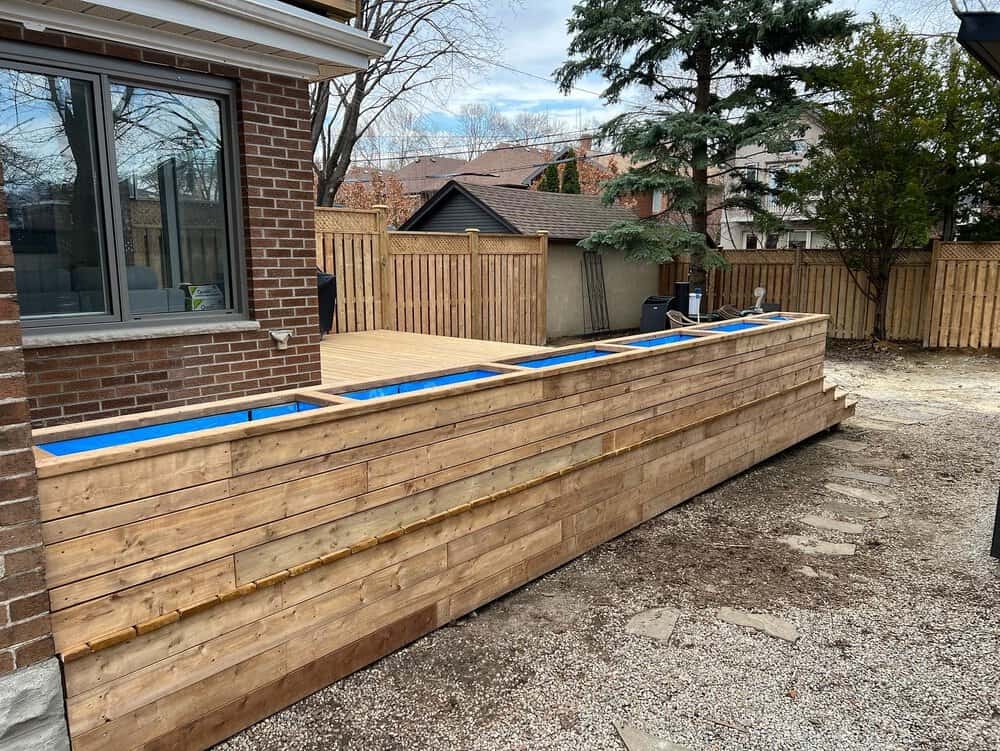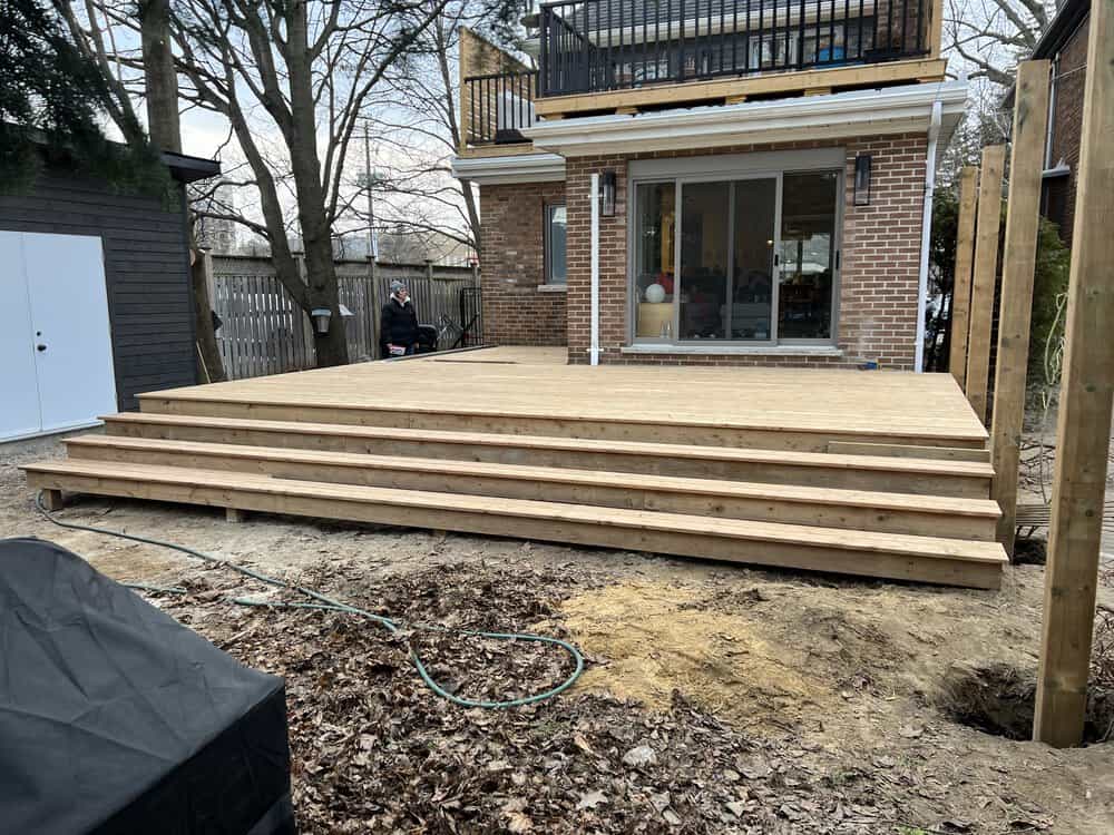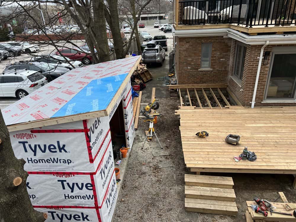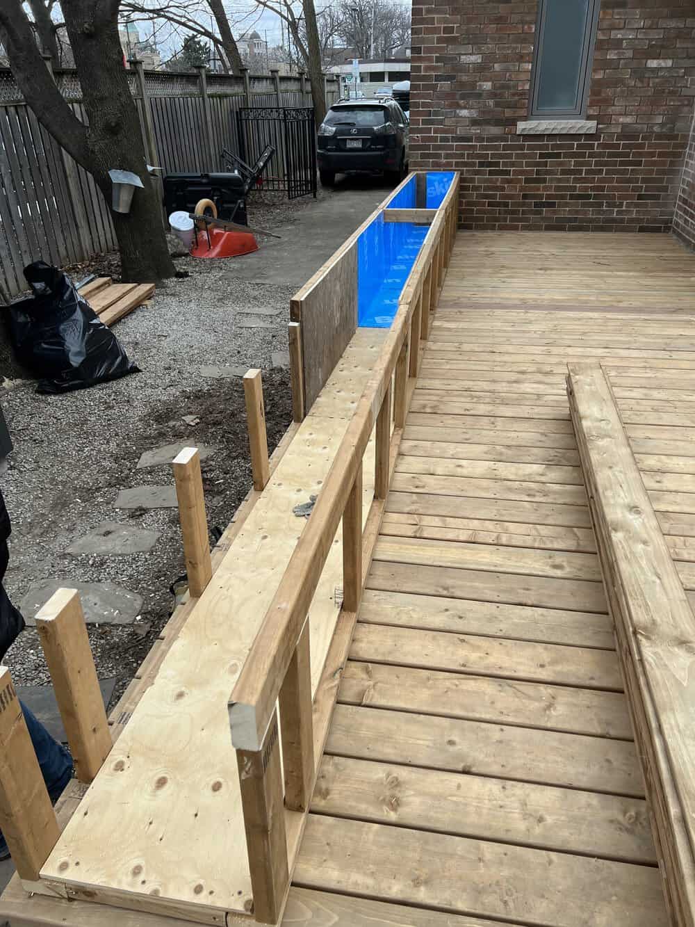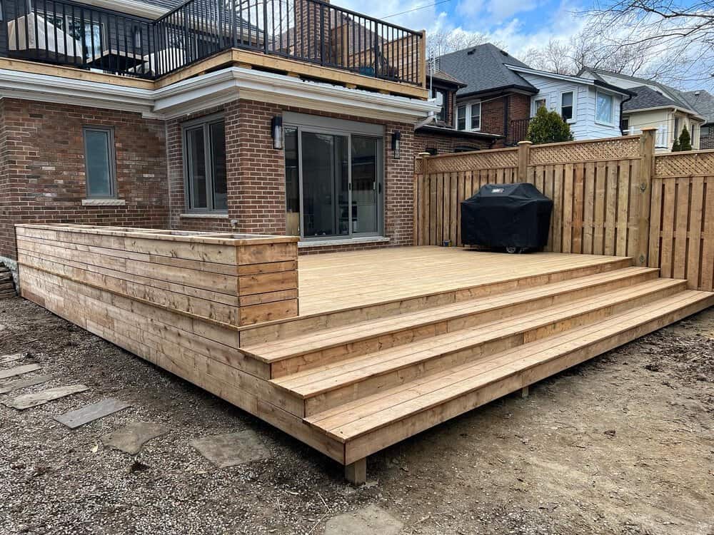 The rebuild focused on maximizing the entire area, with new deck and fence structures constructed primarily from pressure-treated lumber for durability and resistance to the elements. A new storage shed was also built to improve functionality and provide dedicated space for outdoor equipment.